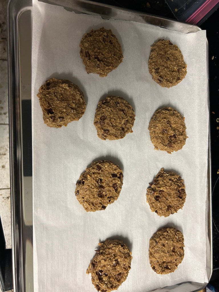 1/2 c Oats blitzed with 1/2 c smashed overripe banana; 1/4 c Smuckers Natural Peanut Butter (Peanuts and Salt are the only ingredients), and vanilla in the Food Processor. Then, I added a handful of dark chocolate chips and stirred with a spatula. Press down cookies, they don’t spread. Baked at 350 for 14 mins. Yield 12 cookies