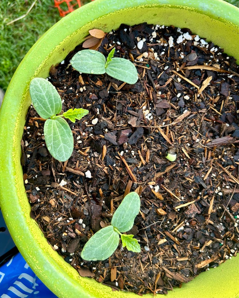 And, finally, my loofah is popping up. Yes, friends, I do mean the loofahs you can buy in the store for sponges. Once they get to maturity and dry out, you can turn them into sponges by peeling back the dried out skin and getting rid of the seeds. There are fibers inside that grow thick as they age.
