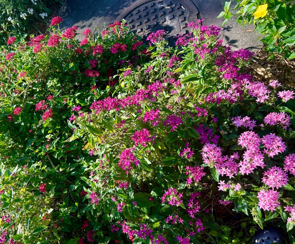 Red, fuchsia, and pink Pentas are all still giving me the blooms. You can even see a hint of the Butttercup and white Pentas blooming on either side.